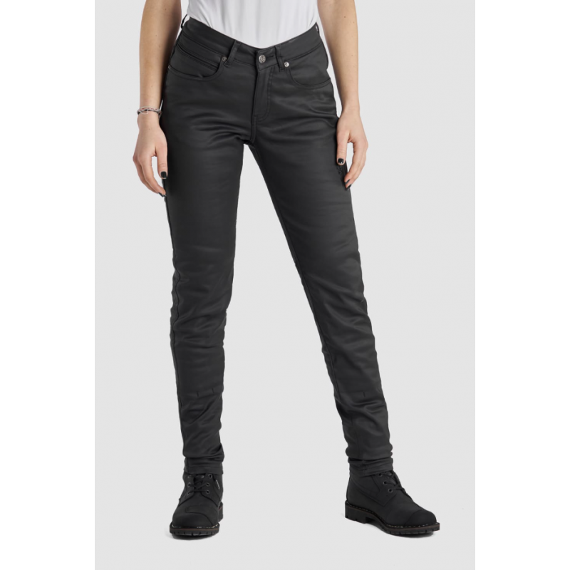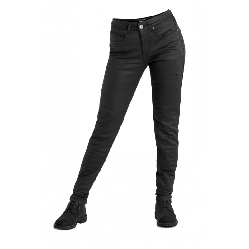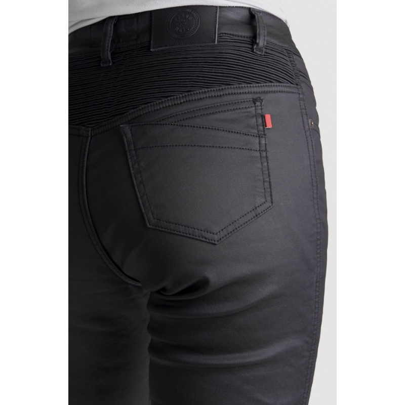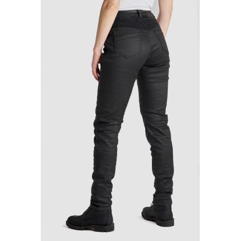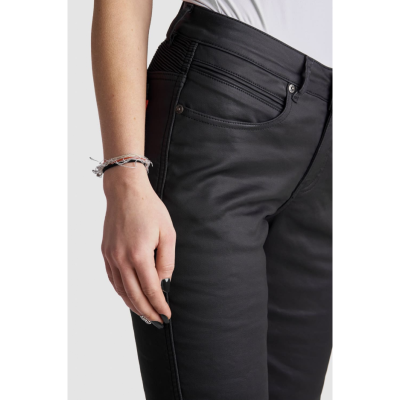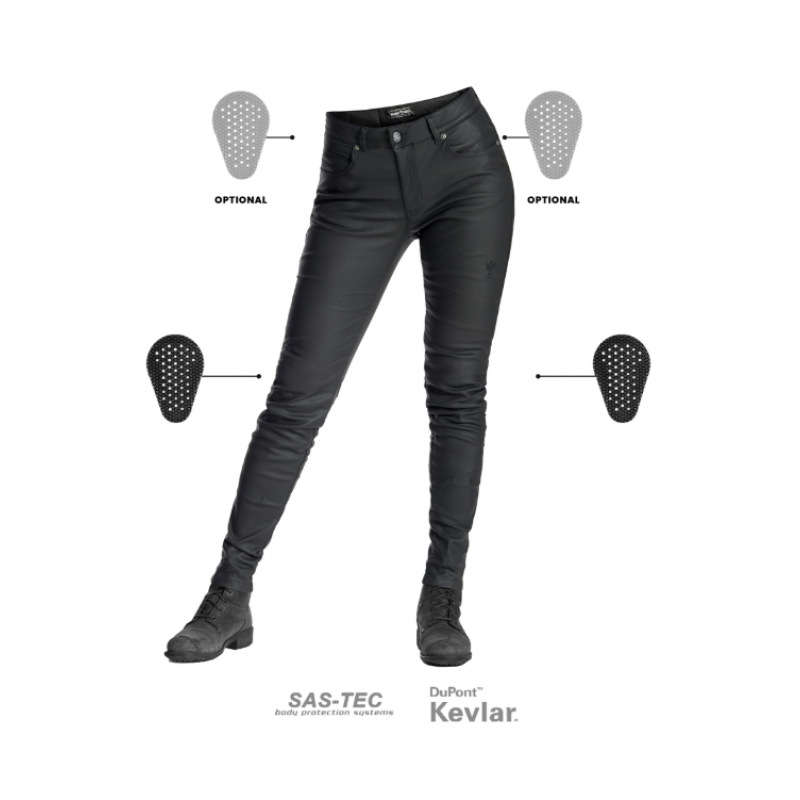 Изработени от здрав power-stretch ваксиран деним, дамските мото дънки Lorica Kev 02 разполагат с подплата DuPont™ Kevlar в зоните с най-висок риск и при удар. Този издръжлив материал предлага изключителна устойчивост на протриване, предпазвайки мотористите при плъзгане и триене. След независими тестове защитните дънки са CE сертифицирани с ниво на защита A съгласно стандарт EN 17092-4:2020.