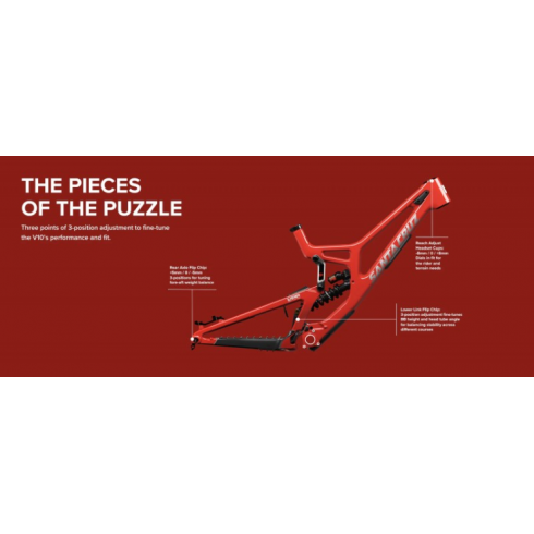 V10 е велосипедът, с който Syndicate постига победи в Световната купа. Сега, в осмото си поколение, V10 е напълно преработен, без да се преоткрива. Той е предназначен за всички, които се стремят към най-високите цели, които подражават на своите идоли и които търсят най-добрите линии в велопарка. За всички, които знаят, че няма заместител на истински велосипед за спускане. Кръг след кръг, ден след ден, нищо не се спуска по склона като велосипед за спускане. Нищо.