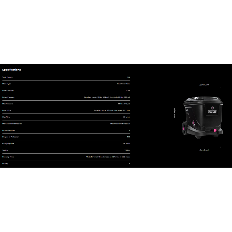 Захранвана от 40V литиево-йонна батерия и 500W мотор, с вграден 20-литров резервоар за вода, тази компактна и мощна система е проектирана да премахва калта и замърсяванията бързо и ефективно, като същевременно защитава чувствителните лагери, повърхности и окачване.