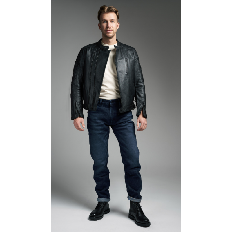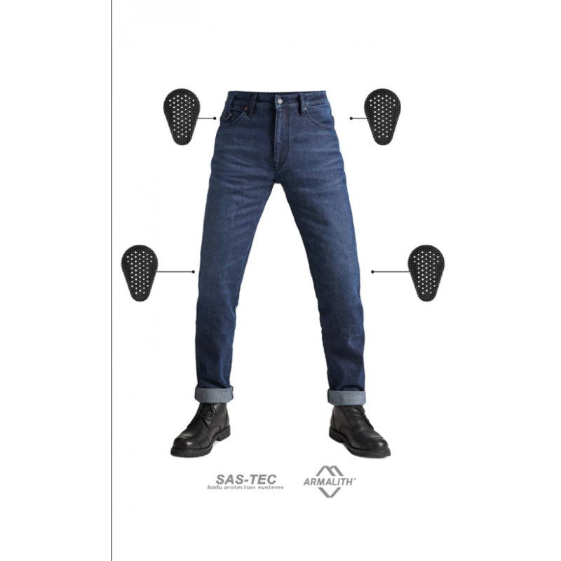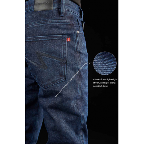 Тези класически дънки с нормална талия са леки, еластични и изключително удобни. Изработени са от Armalith® материя, която е устойчива на UV лъчи, протриване и разкъсване. Благодарение на защитните свойства на този материал, в комбинация с включените протектори за коленете и ханша, тези еднослойни мото дънки постигат най-високото ниво на защита CE AAA.