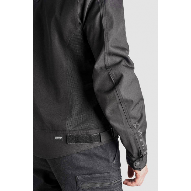 Това леко мото яке включва специална халка за свързване яке–панталон, която гарантира, че якето остава стабилно на място по време на каране. Вентилационни отвори на гърдите и ръкавите осигуряват допълнителен въздушен поток, а два предни джоба позволяват съхранение на лични вещи. За по-добра видимост при слаба осветеност, Air Tate Jacket Black разполага със светлоотразителен принт Pando Moto по отвора на маншета на външното яке, както и върху гърдите и под задната част на яката на вътрешното яке.