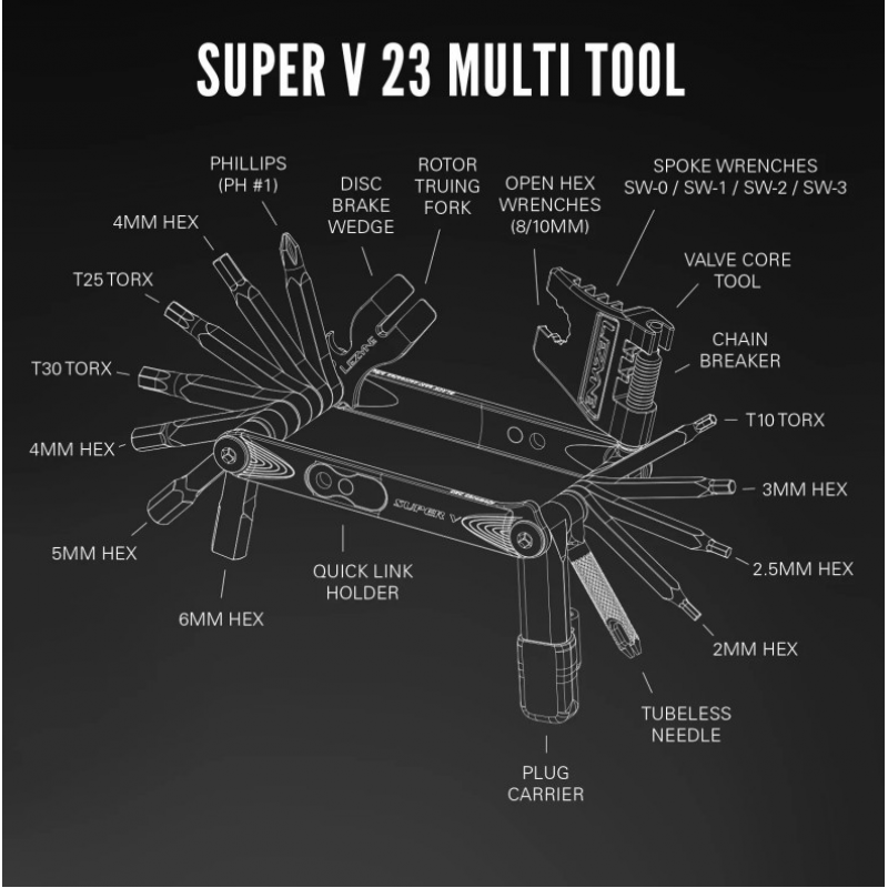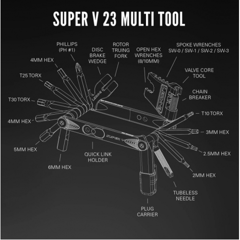 - SUPER V 22: HEX 2/2,5/3/4/5/6/8MM, TORX T10/T25/T30, PHILLIPS, CHAIN BREAKER, 8/10MM WRENCH, 4 SPOKE WRENCHES