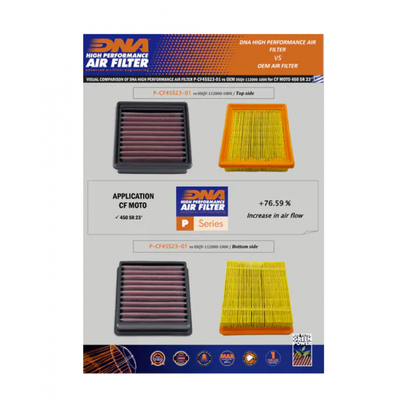 Спортен въздушен филтър DNA за многократна употреба като заместител на оригиналния въздушен филтър е създаден така че да увеличи конските сили и ускорението на мотоциклета като същевременно осигури и отлична филтрация. Филтри DNA се почистват, измиват и омасляват и се използват отново и отново. С форма и дизайн напълно пасваща към оригиналната филтърна кутия, вие имате възможност да увеличите ефективността на вашия мотоциклет изключително лесно.