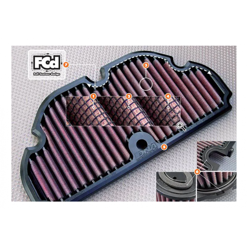 7/ FCd (Full Contour design) - най-малко 20% и до 80% повече площ на филтриране, използвайки DNA FCd технология; Уникален революционен дизайн, иновация от DNA, позволява на нагънатата филтрираща среда да следва точно контура на въздушната кутия, независимо от сложността на формата, като увеличава сериозно въздушния поток. Възползвайки се от пълнaта площ по контура на въздушната кутия, са премахнати „мъртвите точки“, които ограбват мощността. Ако площта е там, защо да не бъде ефективно използвана!