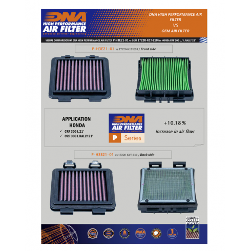 Спортен въздушен филтър DNA за многократна употреба като заместител на оригиналния въздушен филтър е създаден така че да увеличи конските сили и ускорението на мотоциклета като същевременно осигури и отлична филтрация. Филтри DNA се почистват, измиват и омасляват и се използват отново и отново. С форма и дизайн напълно пасваща към оригиналната филтърна кутия, вие имате възможност да увеличите ефективността на вашия мотоциклет изключително лесно.