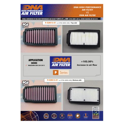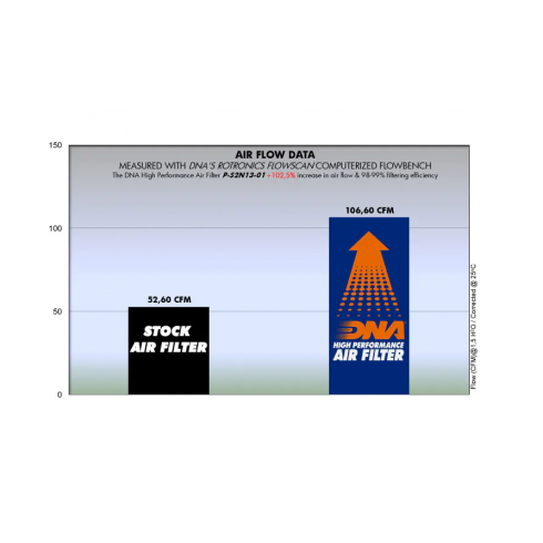 Спортен въздушен филтър DNA за многократна употреба като заместител на оригиналния въздушен филтър е създаден така че да увеличи конските сили и ускорението на мотоциклета като същевременно осигури и отлична филтрация. Филтри DNA се почистват, измиват и омасляват и се използват отново и отново. С форма и дизайн напълно пасваща към оригиналната филтърна кутия, вие имате възможност да увеличите ефективността на вашия мотоциклет изключително лесно.