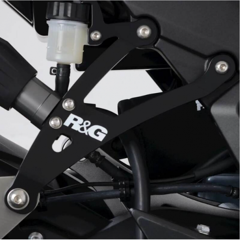 Окачването за изпускателната тръба е изработено от здрав алуминий, с модерен дизайн, което наистина придава стил на мотоциклета, като премахва грозните стъпенки за пътника (особено ако те никога не се използват!). И двете са с черно прахово покритие за качествена и издръжлива повърхност и са с графичен надпис „R&G“.