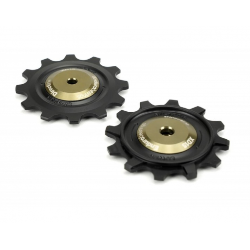 Прецизно изработени ролки за дерайльор Delrin¬Æ с XD-15 керамично-хибридни радиални лагери за подобрено превключване и дълготрайност. Проектирани и произведени за висока производителност, тези ролки са с CN (тесен клирънс) лагери в горната ролка за максимална точност на превключване и C4 (широк клирънс) лагери в долната ролка, за да позволяват движение на веригата.